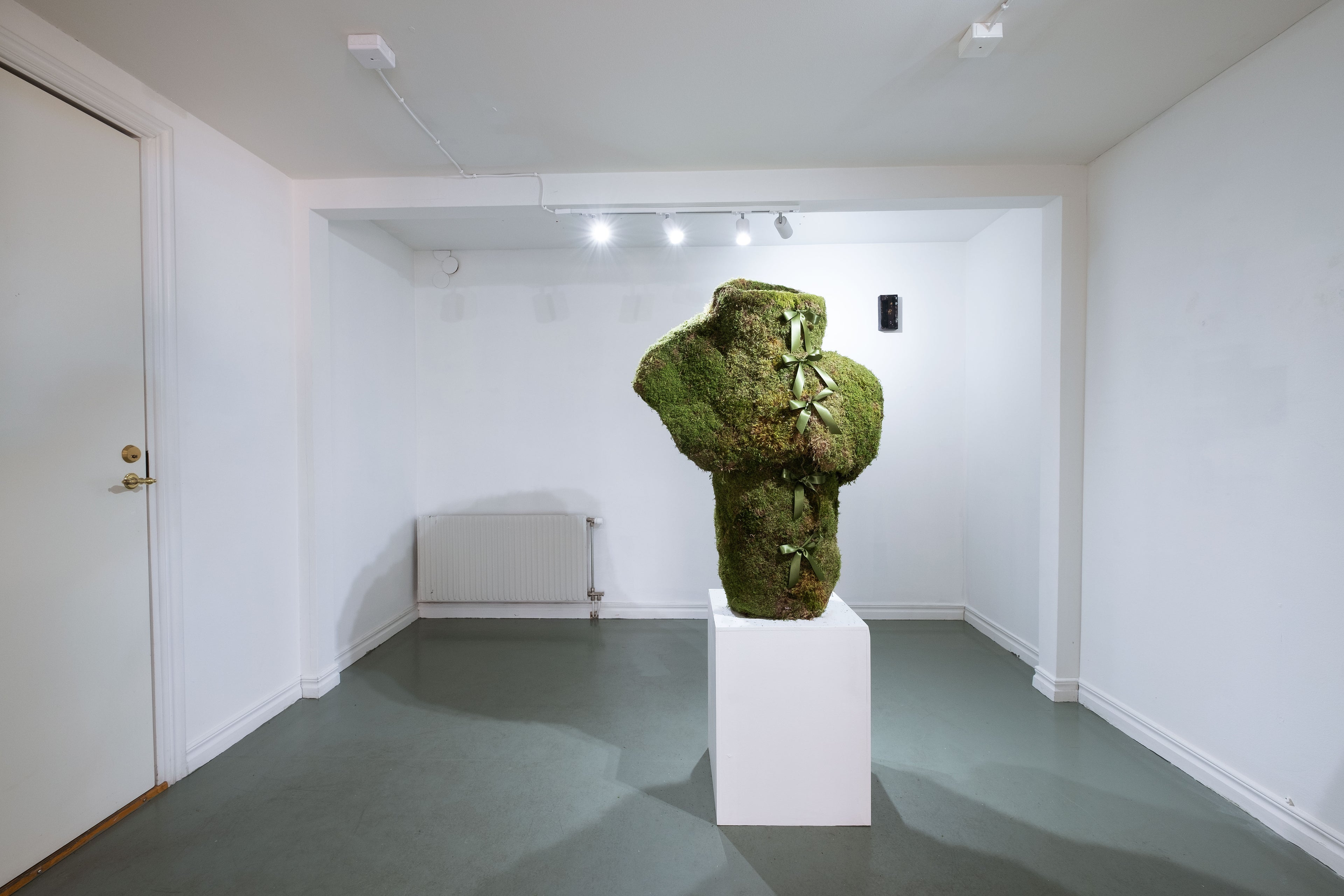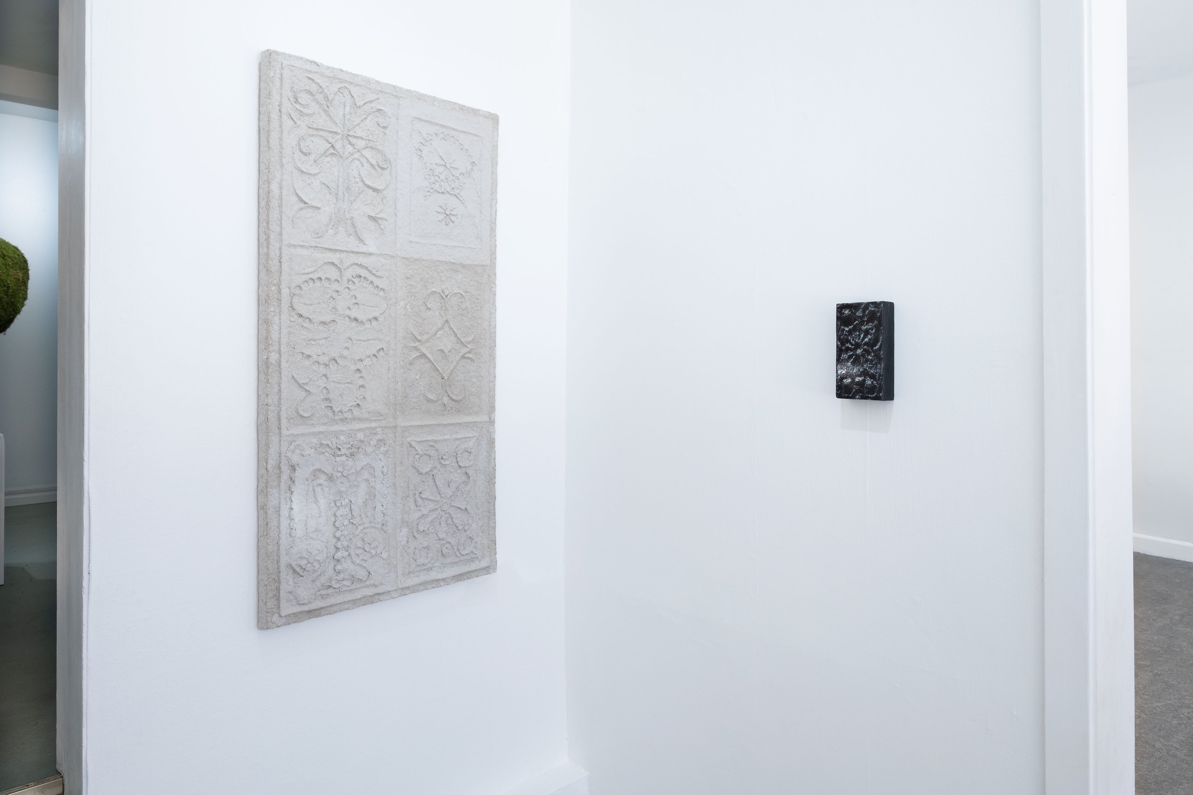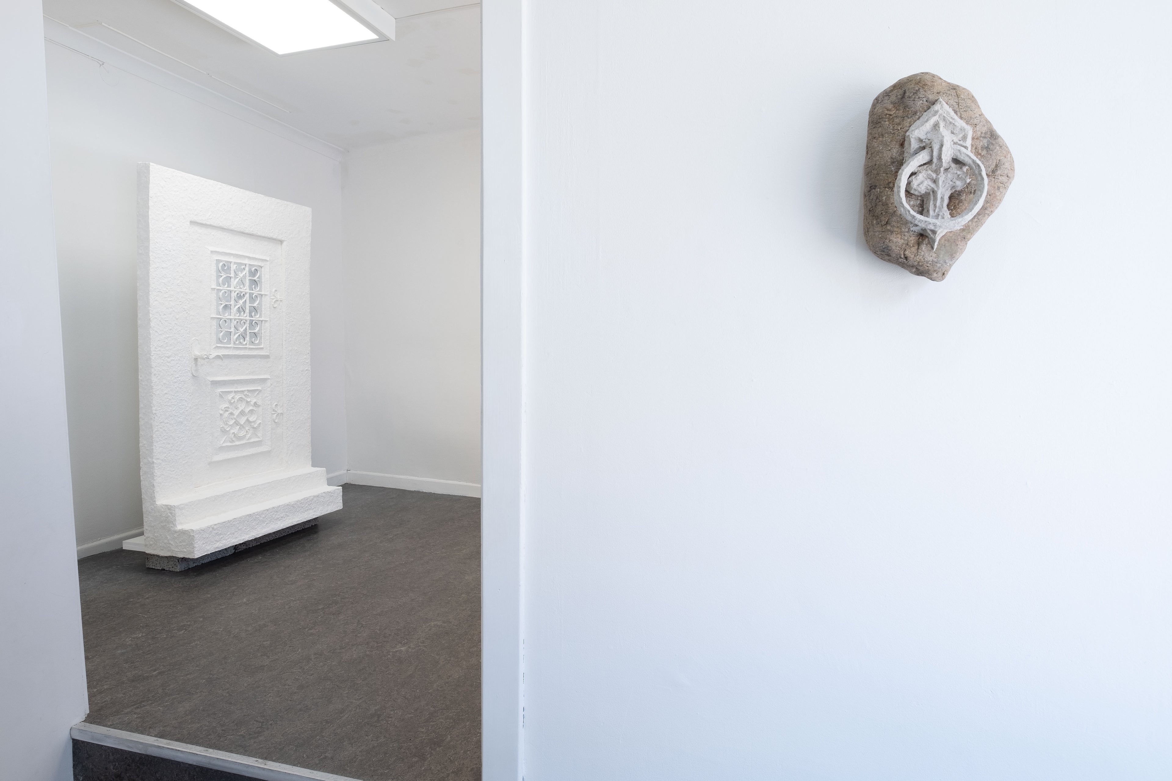 The exhibition presents a selection of works that move between sculpture, artifact, and costume, and narrates a found-object scenario of another world, with strange writings, clothes made of moss and an door knocker, knocking on a stone.