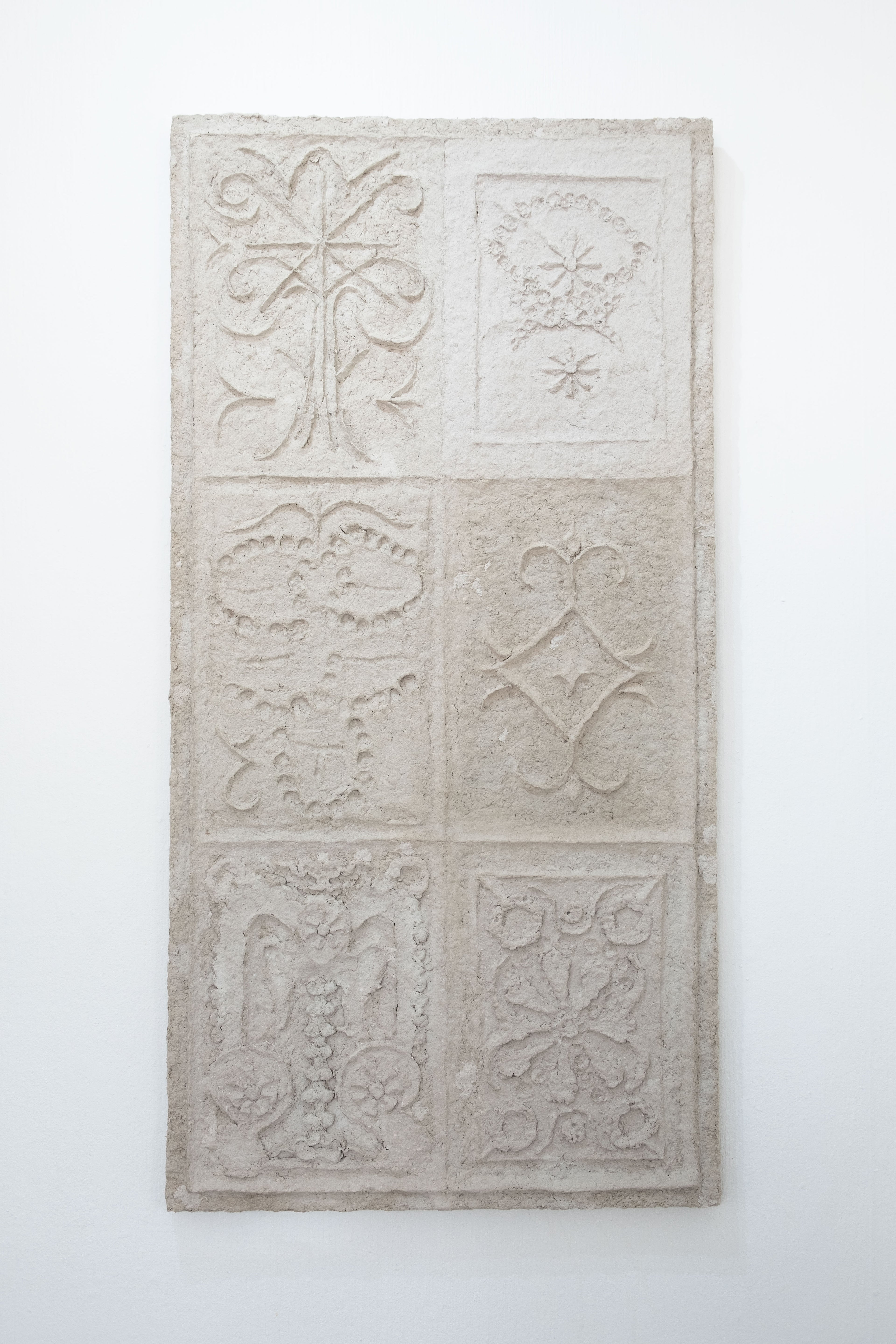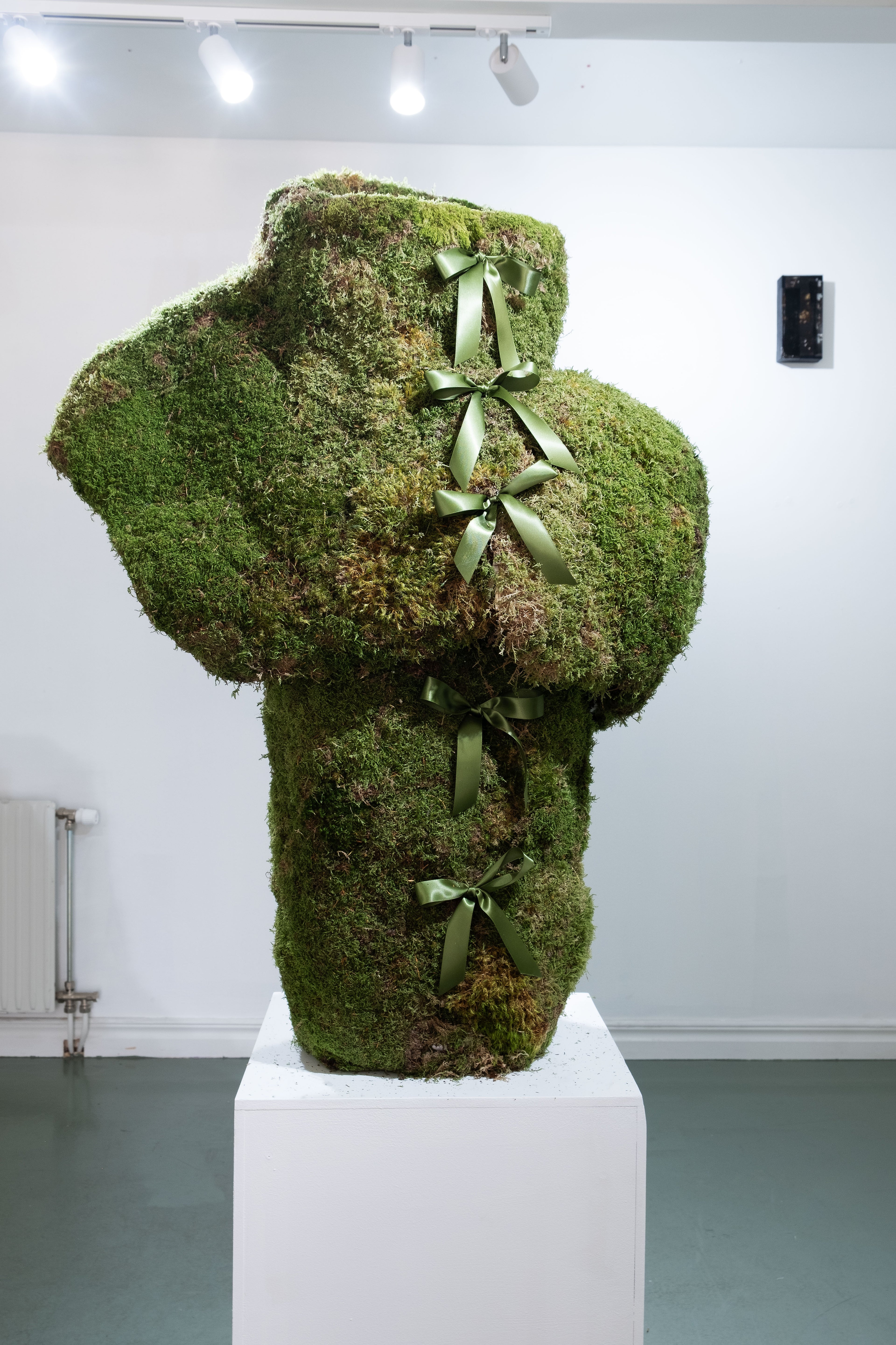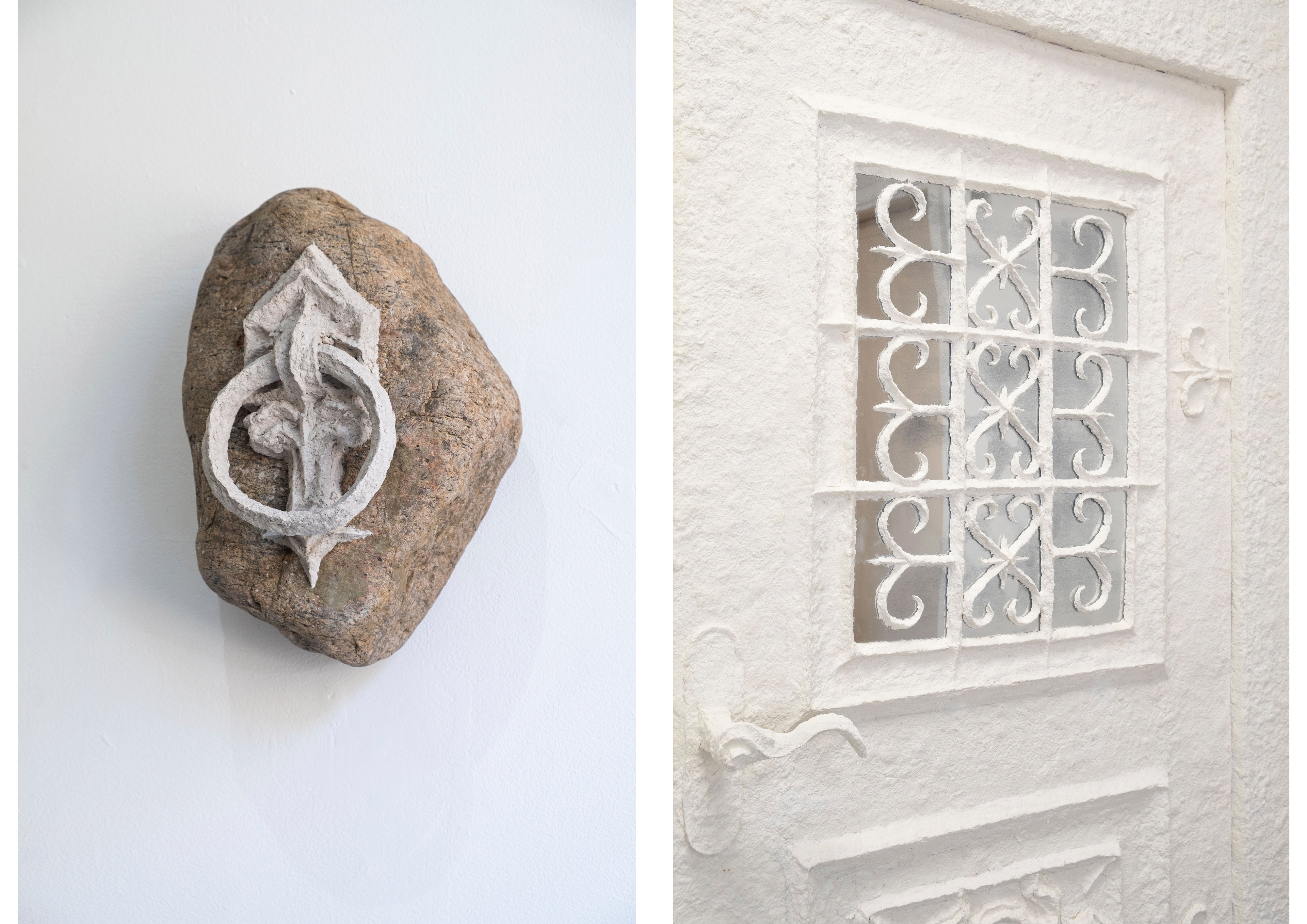 The exhibition presents a selection of works that move between sculpture, artifact, and costume, and narrates a found-object scenario of another world, with strange writings, clothes made of moss and an door knocker, knocking on a stone.